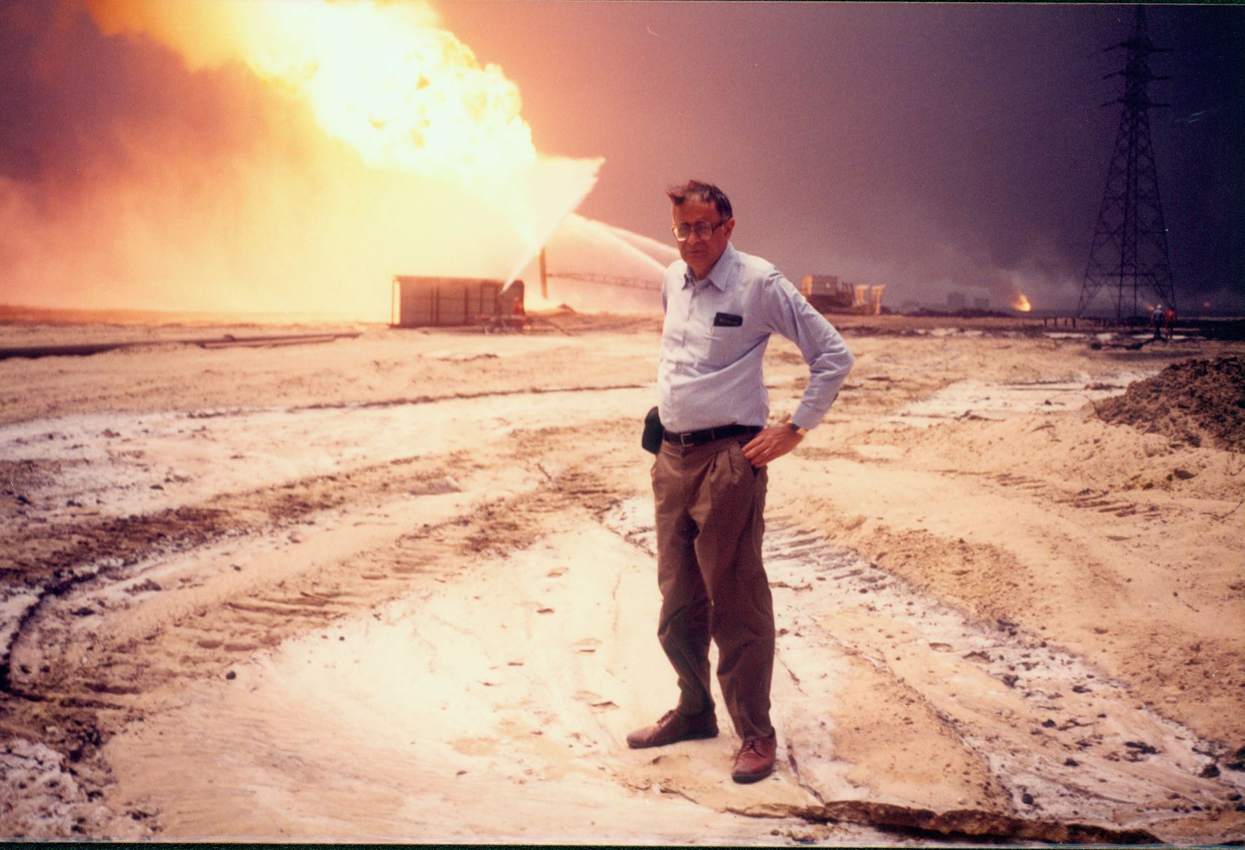 دكتور مصطفى الرفاعى وخلفه آبار البترول التي أشعلها صدام قبل انسحابه