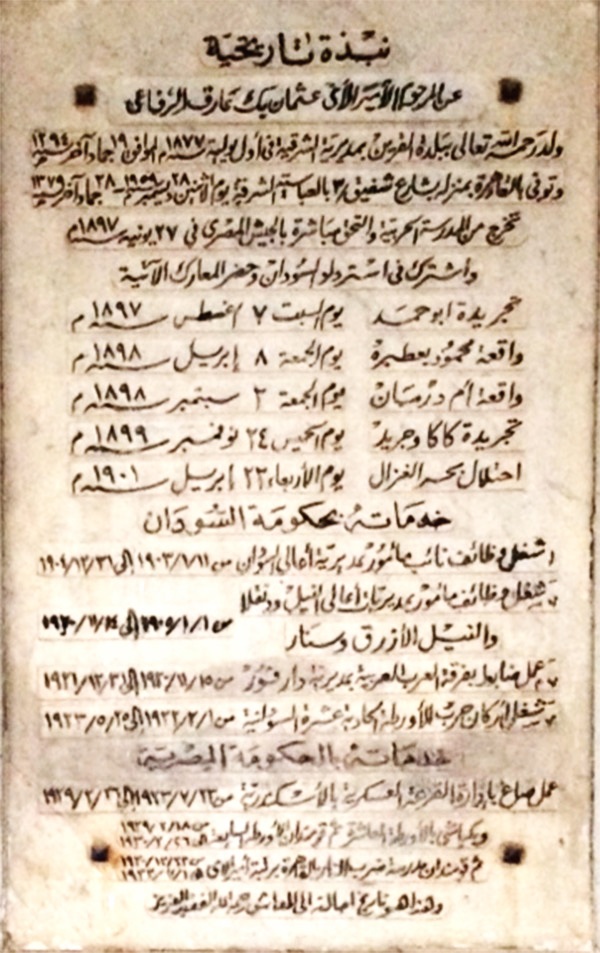 اللوحة التي تعلو مدفن جدي و التي تسجل المعارك التي خاضها لاسترداد السودان وخدماته بها بعد ذلك